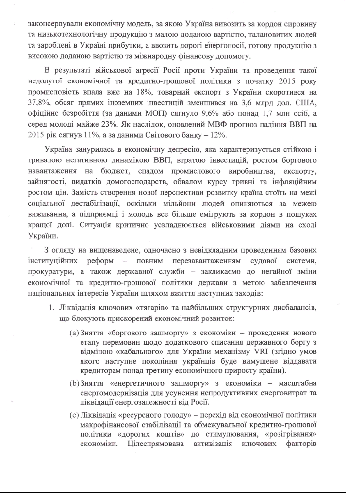 З огляду на вищенаведене, одночасно з невідкладним проведенням базових інституційних реформ – повним перезавантаженням судової системи, прокуратури, а також державної служби – закликаємо до негайної зміни економічної та кредитно-грошової політики держави з метою забезпечення національних інтересів України шляхом вжиття наступних заходів: