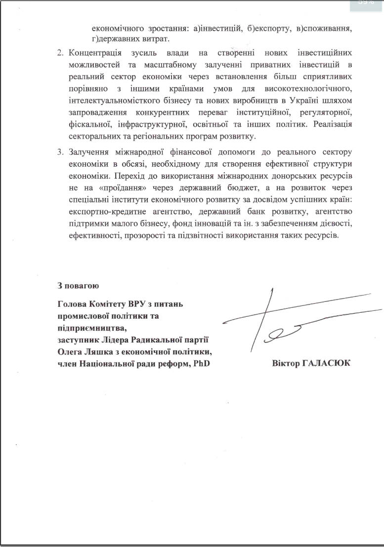 <div class="wideWrapper mainHoverBackground"> <div class="viewportWrapper"> <div class="thinTitleWrap"> <span class="thinTitle"> <span style="color: #D64541"> Радикальна партія </span> </span> <span class="thinBigTitle"> <!-- <img src="logo.png" /> --> Олега Ляшка </span> </div> </div> </div> <div class="mainDecoration"> <div class="side-l"></div> <div class="arrow"> <img alt="Hero-triangle" src="ui/images/triangle.png"> </div> <div class="side-r"></div> </div> <div class="wideWrapper"> <div class="viewportWrapper"> <div class="quoteBlock"> <div class="quoteData"> </div> </div> </div> </div> <div class="wideWrapper sectionSocial"> <div class="viewportWrapper"> <div class="socialWrapper"> <a target="_blank" href="https://www.facebook.com/O.Liashko"><img src="ui/images/fb.png" /></a> <a target="_blank" href="https://twitter.com/ovliashko"><img src="ui/images/tw.png" /></a> <a target="_blank" href="https://www.youtube.com/user/lyashkocomua"><img src="ui/images/youtube.png" /></a> <!--<a target="_blank" href="https://vk.com/o.liashko"><img src="ui/images/vk.png" /></a>--> </div> </div> </div> <script> $(document).ready(function() { $('html, body').animate({ scrollTop: $(".socialWrapper").offset().top }, 400); }); </script> <div class="wideWrapper" style="margin-top: 15px;"> <div class="viewportWrapper"> <div style="clear: both; height: 70px;"> <div class="ribbon"> <div class="ribbon-stitches-top"></div> <strong class="ribbon-content"><h1>Звернення до Президента та Прем’єр-міністра України щодо зміни економічного курсу</h1></strong> <div class="ribbon-stitches-bottom"></div> </div> </div> <div class="newContentTime"> <img style="width: 50px; height: 50px; border-color: transparent; border-radius: 9999px;" src="image_upload/1429703631image.jpg"> <div style="display: inline-block; vertical-align: top; margin-top: 6px; margin-left: 3px;"> <a href="person/12">Віктор Галасюк<br></a> 10 Oct 2015, 16:49 </div> </div> <div style="float: right"> <span class='st_facebook' displayText='Facebook'></span> <span class='st_twitter' displayText='Tweet'></span> <!--<span class='st_vkontakte' displayText='Вконтакте'></span> <span class='st_odnoklassniki' displayText='Одноклассники'></span>--> <span class='st_googleplus' displayText='Google +'></span> </div> <div class="newContentText"> <p><iframe allowfullscreen="" frameborder="0" height="360" src="//www.youtube.com/embed/uLNTc-RoZ-g" width="640"></iframe></p> <p>Українська економіка за останні 25 років скоротилась на 35%.  Згідно з даними Світового банку, це найгірший результат у світі. Із 166 країн, які мали й розкрили повну статистику ВВП за 1991–2014 рр., він знизився лише в п’яти випадках. Україна «випередила» Молдову (-29%), Грузію (-15,4%), Зімбабве (-2,3%) і Центральноафриканську Республіку (-0,94%). ВВП інших країн збільшився: з мінімальним приростом у Барбадосі (8,9%) і Таджикистані (10,6%), а у Китаї ВВП зріс у 10 разів. А ми втратили третину ВВП в реальному вимірі, хоча в 1990 році за ВВП на душу населення (за паритетом купівельної спроможності) мали стартову позицію кращу за Малайзію, Польщу та Білорусь, знаходилися на одному рівні з Туреччиною та Румунією.</p> <p>Такий безпрецедентний економічний спад в Україні відбувся на фоні масштабної тінізації та монополізації економіки, технологічної примітивізації виробництва та деіндустріалізації, розквіту корупції та формування і консервації олігархічно-сировинного ладу. Натомість країни, які запроваджували економіку підприємницької ініціативи, справедливої ринкової конкуренції, нових інвестиційних можливостей та випуску продукції з високою доданою вартістю, успішно розвивались. Як наслідок, реальний ВВП України на душу населення (за паритетом купівельної спроможності) у 2014 році склав 8 267 дол. США, що вдвічі менше за ВВП Білорусі, Румунії, Туреччини та втричі менше за ВВП Малайзії чи Польщі. Номінальний ВВП України склав 2 314 дол. США на душу населення.</p> <p>Продовження політики ринкового фундаменталізму, однобоке фокусування на дерегуляції та приватизації як панацеї, «затягування пасків» населенню та фанатична фіскальна консолідація вкупі з регулярними закордонними запозиченнями, а також обмежувальна кредитно-грошова політика НБУ законсервували економічну модель, за якою Україна вивозить за кордон сировину та низькотехнологічну продукцію з малою доданою вартістю, талано