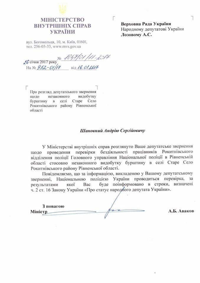 Міністерство внутрішніх справ проводить перевірку працівників Нацполіції у Рокитнівському районі. Про це народному депутату України від Радикальної партії Андрію Лозовому повідомив міністр внутрішніх справ Арсен Аваков.