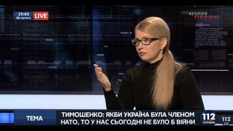 Це скрін з ефіру 112 за 8 лютого. Тимошенко: "Якби Україна була членом НАТО, у нас сьогодні не було б війни".