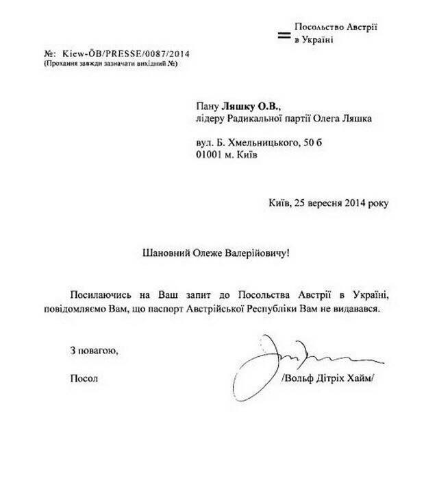 Третє фото - для особо одарьонних нєвєрующіх хом. Офіційна відповідь Надзвичайного і Повноважного Посла Австрії в Україні пана Вульфа Дітріха Хайма щодо відсутності у Ляшка австрійського громадянства. Амінь.