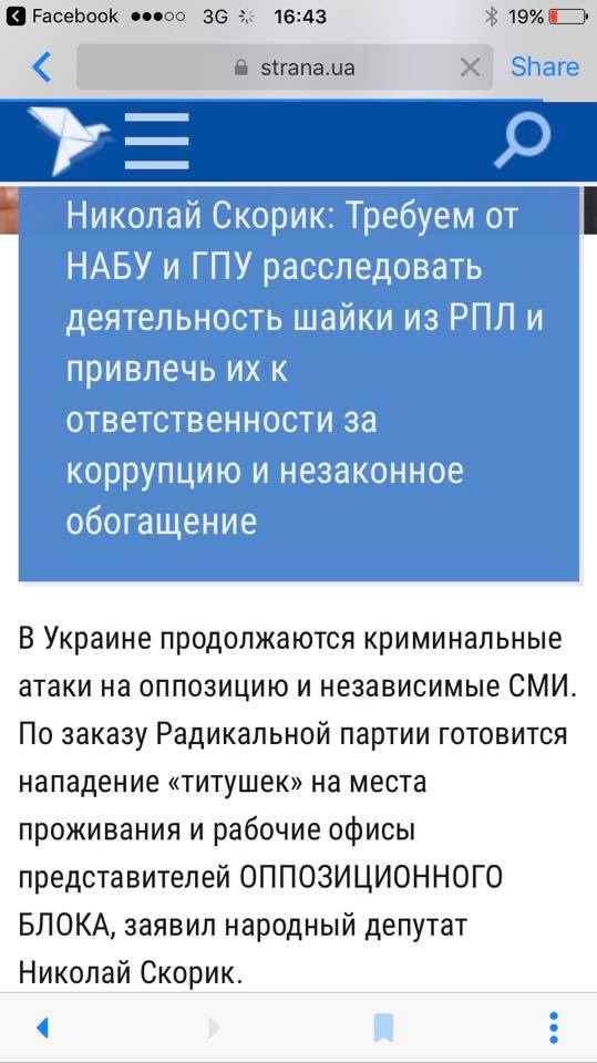 <div class="wideWrapper mainHoverBackground"> <div class="viewportWrapper"> <div class="thinTitleWrap"> <span class="thinTitle"> <span style="color: #D64541"> Радикальна партія </span> </span> <span class="thinBigTitle"> <!-- <img src="logo.png" /> --> Олега Ляшка </span> </div> </div> </div> <div class="mainDecoration"> <div class="side-l"></div> <div class="arrow"> <img alt="Hero-triangle" src="ui/images/triangle.png"> </div> <div class="side-r"></div> </div> <div class="wideWrapper"> <div class="viewportWrapper"> <div class="quoteBlock"> <div class="quoteData"> </div> </div> </div> </div> <div class="wideWrapper sectionSocial"> <div class="viewportWrapper"> <div class="socialWrapper"> <a target="_blank" href="https://www.facebook.com/O.Liashko"><img src="ui/images/fb.png" /></a> <a target="_blank" href="https://twitter.com/ovliashko"><img src="ui/images/tw.png" /></a> <a target="_blank" href="https://www.youtube.com/user/lyashkocomua"><img src="ui/images/youtube.png" /></a> <!--<a target="_blank" href="https://vk.com/o.liashko"><img src="ui/images/vk.png" /></a>--> </div> </div> </div> <script> $(document).ready(function() { $('html, body').animate({ scrollTop: $(".socialWrapper").offset().top }, 400); }); </script> <div class="wideWrapper" style="margin-top: 15px;"> <div class="viewportWrapper"> <div style="clear: both; height: 70px;"> <div class="ribbon"> <div class="ribbon-stitches-top"></div> <strong class="ribbon-content"><h1>Я публічно з*їм свої шкарпетки, якщо...</h1></strong> <div class="ribbon-stitches-bottom"></div> </div> </div> <div class="newContentTime"> <img style="width: 50px; height: 50px; border-color: transparent; border-radius: 9999px;" src="image_upload/1429523284image.jpg"> <div style="display: inline-block; vertical-align: top; margin-top: 6px; margin-left: 3px;"> <a href="person/10">Андрій Лозовий<br></a> 20 Sep 2017, 11:10 </div> </div> <div style="float: right"> <span class='st_facebook' displayText='Facebook'></span> <span class='st_twitter' displayText='Tweet'></span> <!--<span class='st_vkontakte' displayText='Вконтакте'></span> <span class='st_odnoklassniki' displayText='Одноклассники'></span>--> <span class='st_googleplus' displayText='Google +'></span> </div> <div class="newContentText"> <p>...регіоналівський недобиток, депутат від промосковського Опобльоку Микола Скорик доведе те, що хоч одну людину сьогодні на акцію ми покликали за гроші.</p> <p>Підлизуючись до свого господаря Льовочкіна, ватнік Скорик перейшов межу здорового ґлузду.</p> <p>Ватнік Скорик назвав "тітушками" ветеранів національно-визвольної війни на Донбасі, волонтерів, громадських активістів, народних депутатів, депутатів місцевих рад.</p> <p>Ватнік Скорик - безпринципна істота, ціна поглядів якої - його голосування за ініційовані Генпрокурором зміни до кримінально-процесуального кодексу.</p> <p>Ватнік Скорик особисто керував тітушками, які 23 лютого 2014 року в Одесі калічили активістів місцевого Євромайдану і журналістів.</p> <p><a href="https://www.facebook.com/LlutsenkoYuri?fref=mentions">Юрій Луценко</a>, нагадую, що 7 вересня 2016 ви заявляли, що провина Скорика доведена і в найближчий час ви внесете подання на притягнення його до кримінальної відповідальності і арешт.</p> <p>Юрій Віталійович, а де ж подання?</p> <p>Чи голосування Скориком за ваші зміни до КПК - це індульгенція за його злочини?</p> <p>________<br /> Дуже символічно, що Льовочкіна захищає Скорик. Бо обидва - по лікоть в крові.</p> <p><a href="https://www.facebook.com/hashtag/%D0%BB%D1%8C%D0%BE%D0%B2%D0%B0_%D0%BF%D1%96%D0%B4%D0%B0%D1%80%D0%B5%D1%88%D1%82?source=feed_text&story_id=2115304525161933">#льова_підарешт</a></p> <p><strong>Андрій Лозовий,</strong></p> <p><strong>Народний депутат України, </strong></p> <p><strong>Заступник лідера Радикальної партії</strong></p> <p><strong><img alt="" src="/files/upload/images/%D1%81%D1%82%D1%80%D0%B0%D0%BD%D0%B0%D1%82%D0%B8%D1%82%D1%83%D1%88%D0%BA%D0%B8.jpg" style="height:960px; width:539px" /></strong></p> </div> </div> </div> </div> <script> $(document).ready(function() { $('.lastPhotosSection img').click(function() { document.location = 'gallery'; }); }); </script> <div class="wideWrapper sectionSocial" style="margin-top: 25px;"> <div class="viewportWrapper"> <div class="lastPhotosSection"> <img src="image_upload/100149663155a02001018a07.58462624_image.jpg" /> <img src="image_upload/1002708797557d883f7213b8.16726778_image.jpg" /> <img src="image_upload/100979503654fd9b45e7ea47.30558614_image.jpg" /> <img src="image_upload/1012158496553610aea5b995.01569481_image.jpg" /> <img src="image_upload/1012182984558964f0904b94.24800355_image.jpg" /> <img src="image_upload/101563075755880a4bd2da46.07335739_image.jpg" /> <img src="image_upload/101566222655968e03026e42.31279502_image.jpg" /> <img src="image_upload/1015733747551e297a72c333.08617678_image1.JPG" /> <img src="image_upload/1017669135486fb9c0d1c47.14581150_image.jpg" /> <img src="image_upload/10180558885