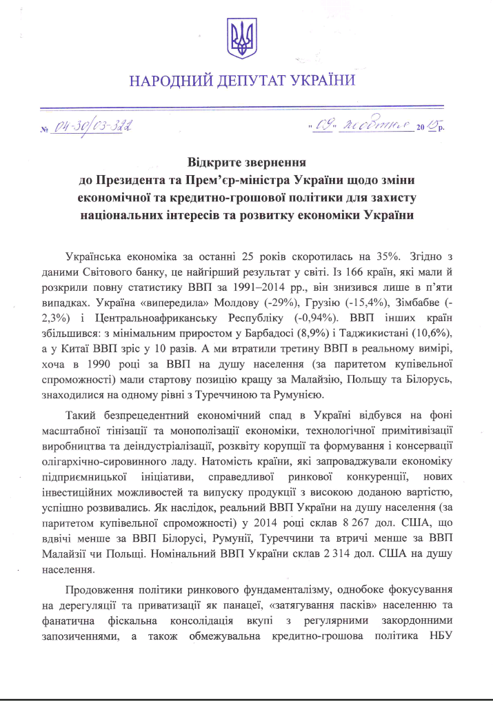 Звернення до Президента та Прем’єр-міністра України щодо зміни економічного курсу