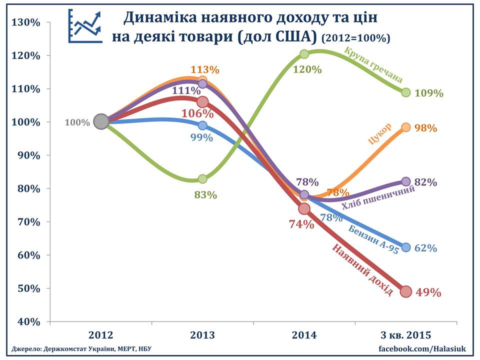 Останнє: “Вимірювання середньомісячного наявного доходу на одну особу в доларах – явне маніпулювання, бо все ж і доходи і видатки більшості українців відбуваються у гривні, й кардинальної зміни цих даних не зафіксовано.”