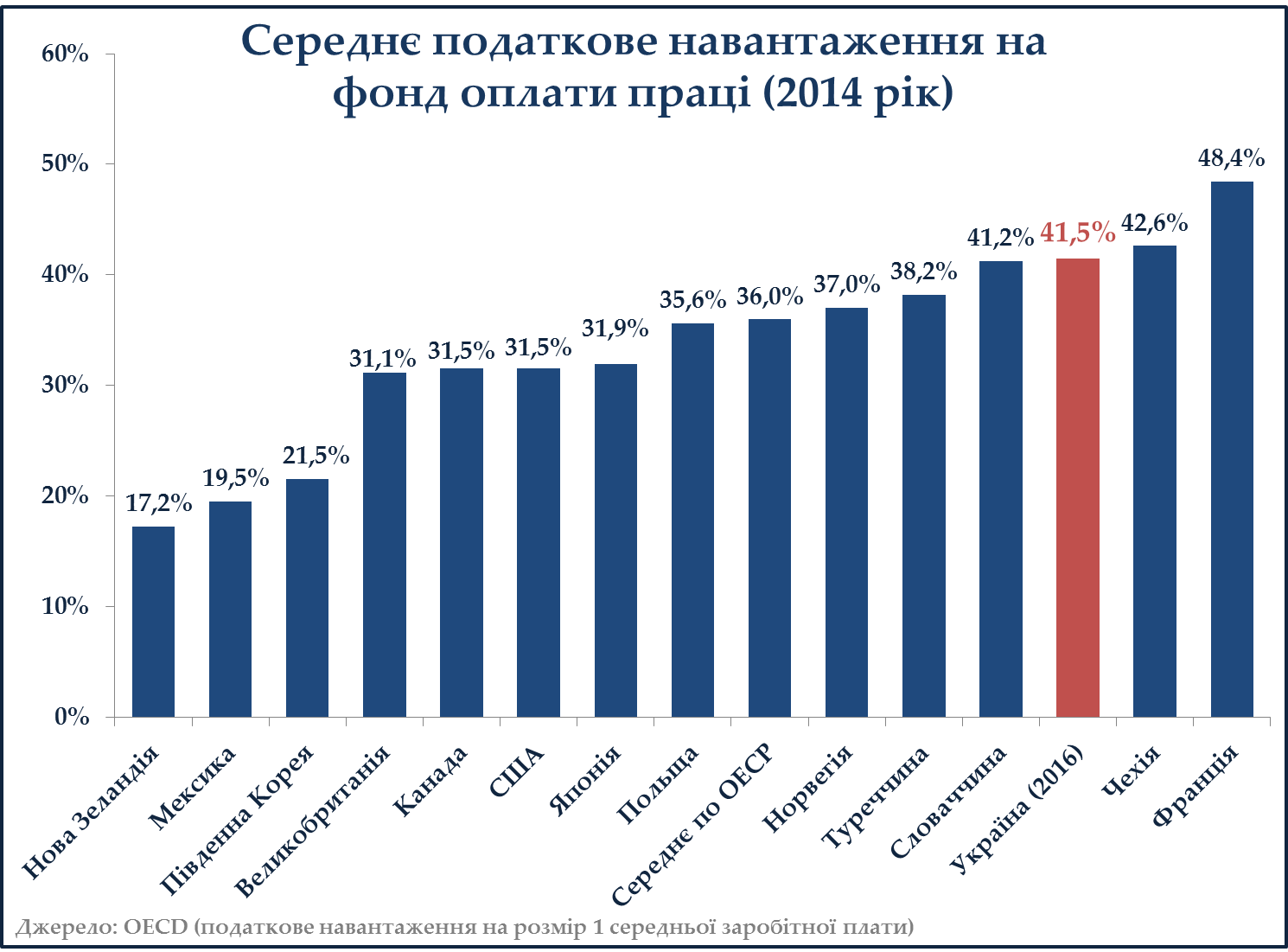 На малюнку фактичний результат майже піврічної роботи Мінфіну над податковою реформою. Скорочення на 0,6% фіскального навантаження на фонд оплати праці, яке де факто залишає понад 300 млрд грн зарплати “в тіні”. Більше того, таке податкове навантаження на заробітну плату залишається одним із найвищих в світі, для порівняння аналогічний показник в Туреччині – 38,2%, Польщі – 35,6%, Японії – 31,9%, США та Канаді – 31,5%, Південній Кореї – 21,5%, а в середньому по країнам ОЕСР – 36%.
