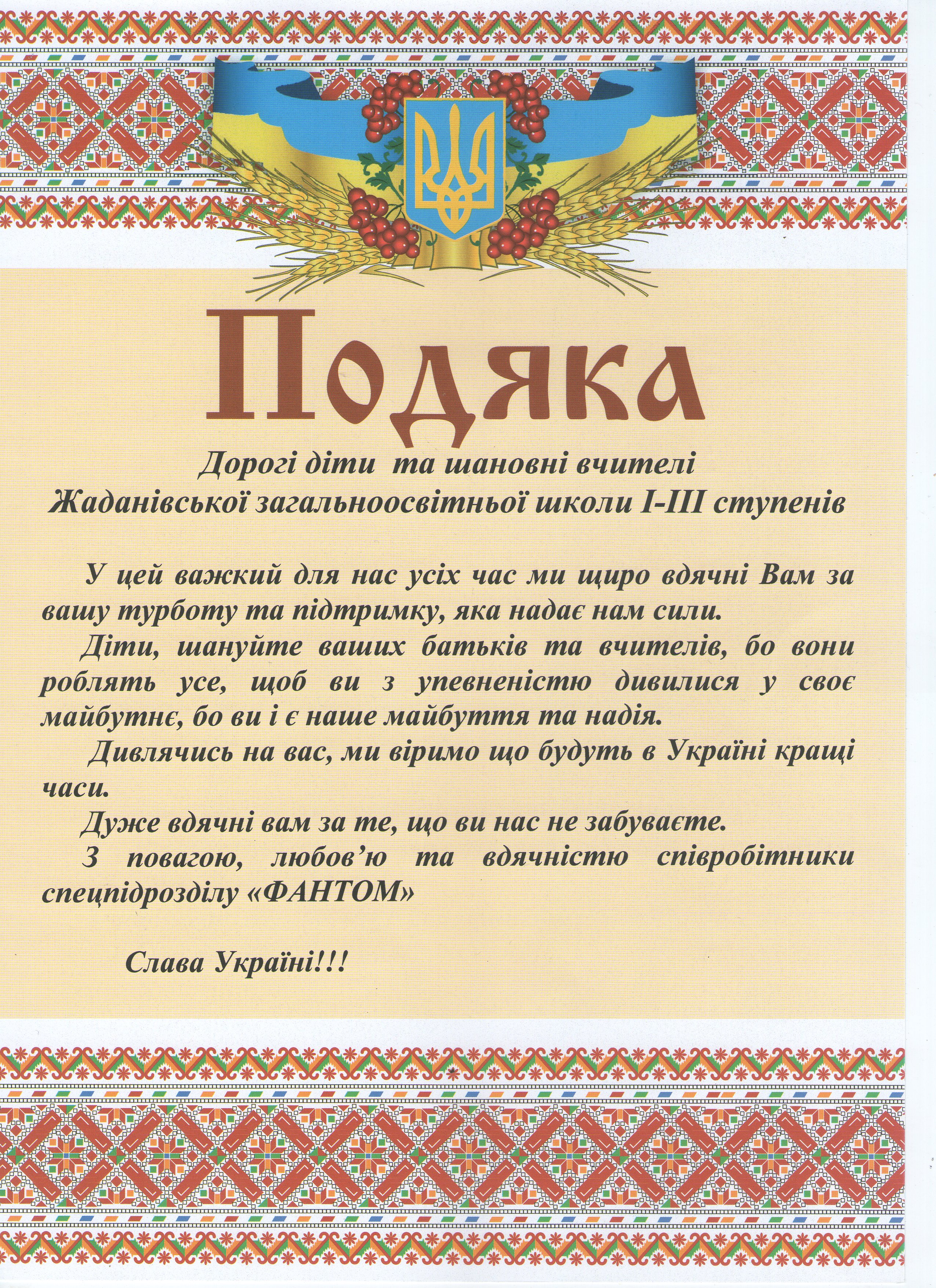 Радикали вдячні співробітникам «Фантому» і передали школам підписані ними прапори України. Під час урочистих лінійок ці речі разом зі словами вдячності вручав дітям голова Іллінецької районної організації РПЛ у Вінницькій області Пойта. Особливий захват викликає гасло на прапорі: «Ніколи не здавайся і ти побачиш, як здаються інші».
