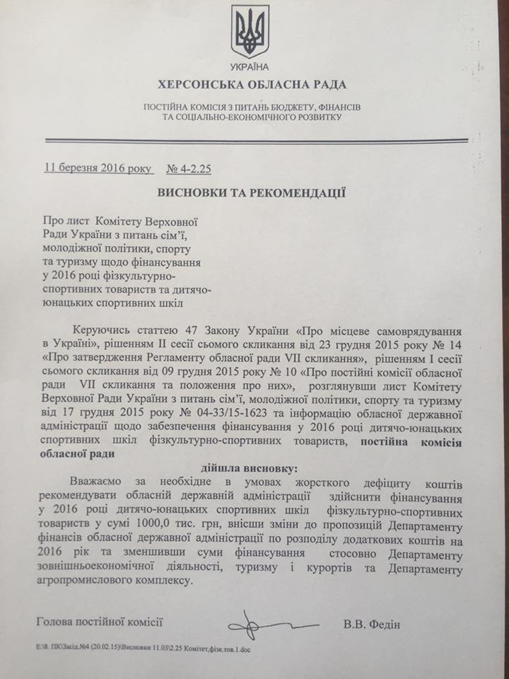 «У той час, як Міністерство молоді спорту привласнює собі чужі заслуги і досягнення, ми просто робимо свою роботу і виборюємо інтереси дітей, яким потрібно займатися спортом. Тепер питання фінансування спортивних шкіл Херсонської області вирішено»,  - повідомив нардеп.