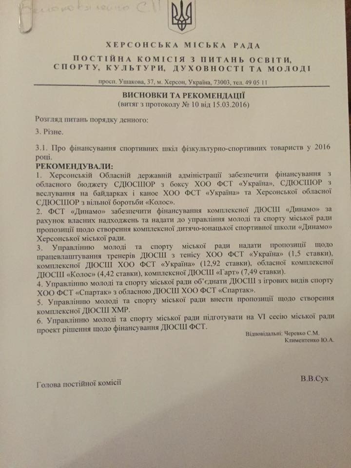 Він також оприлюднив протоколи рішень бюджетних комісій міста і області, в яких йдеться, що кошти на фінансування спортивних закладів виділені саме з місцевого і обласного бюджетів.