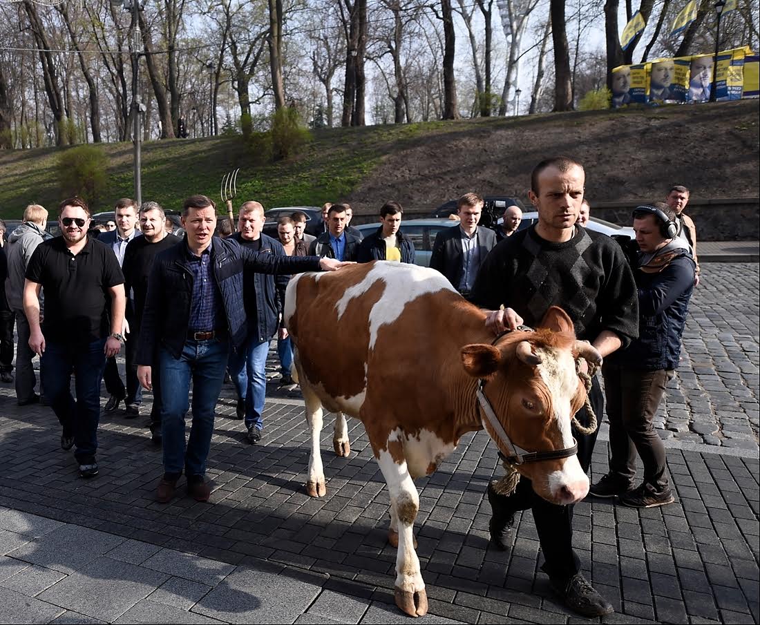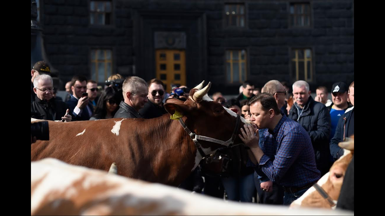 Лідер Радикальної партії Олег Ляшко привів під Кабінет Міністрів українських доярок та їх підопічних - корів. Нардеп озвучив дві вимоги до уряду: підняти закупівельну вартість одного літра молока до 5 гривень і повернути пільговий режим оподаткування для селян.