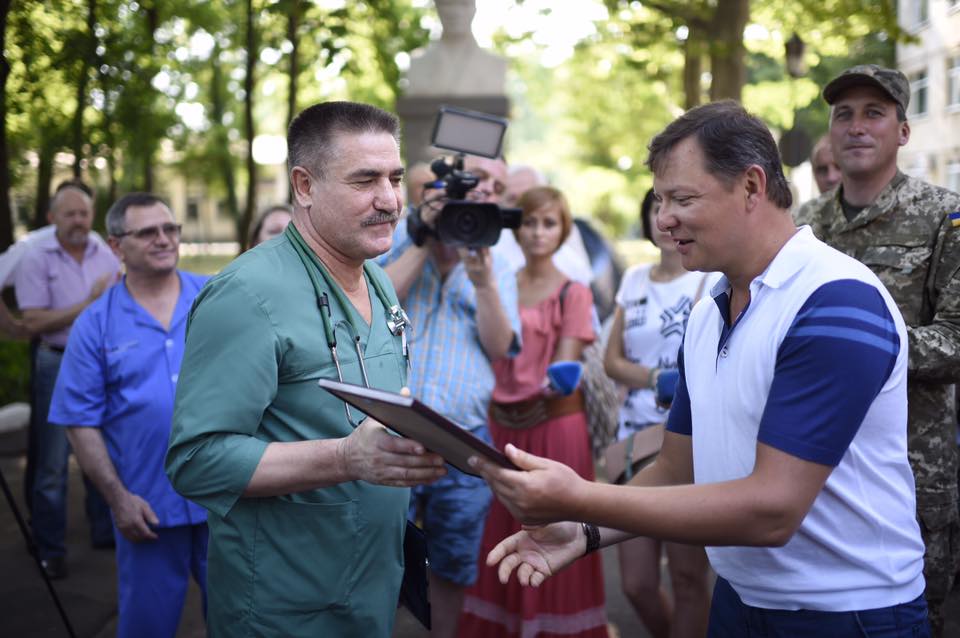 Лідер фракції Радикальної партії Олег Ляшко та його колега-нардеп Сергій Скуратовський побували в одеському військовому шпиталі, привезли обладнання для хірургічного відділення, ліжка та солодкі подарунки для бійців.
