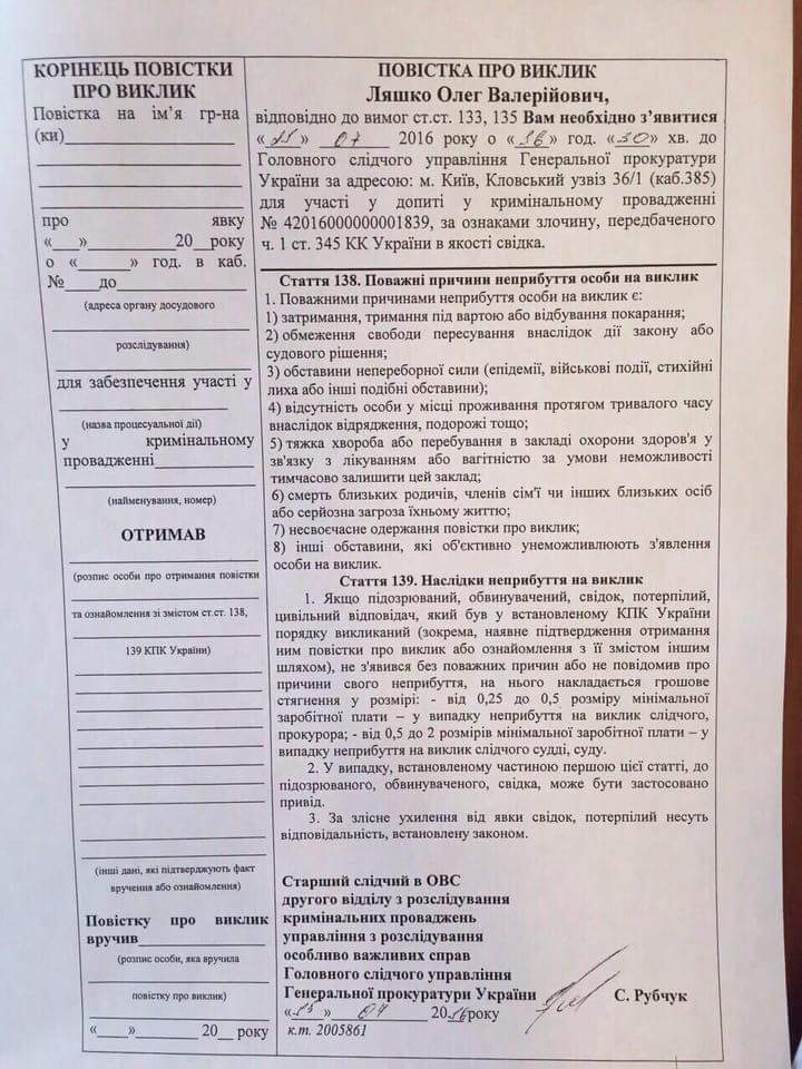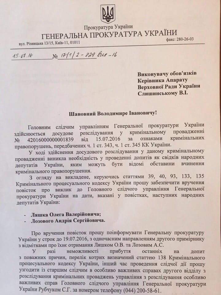 Нагадаємо, депутатів Радикальної партії викликають на  допит у кримінальному провадженні, відкритому  Генеральною прокуратурою за фактом погроз прокурору Чернігівської області Віктору Носенку.  Допит відбудеться за адресою: м.Київ, Кловський узвіз, 36/1.