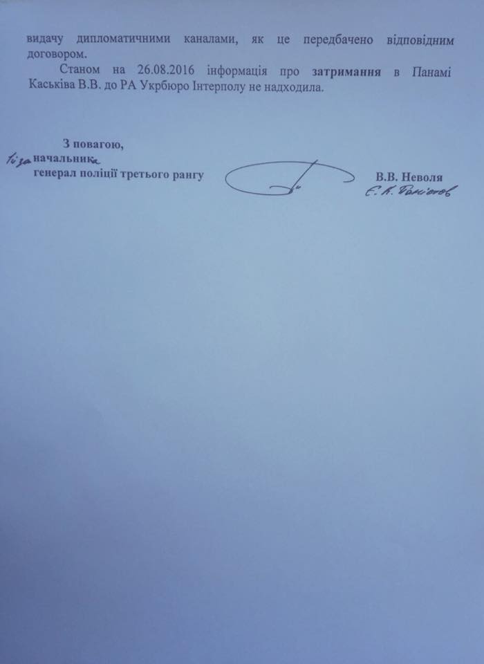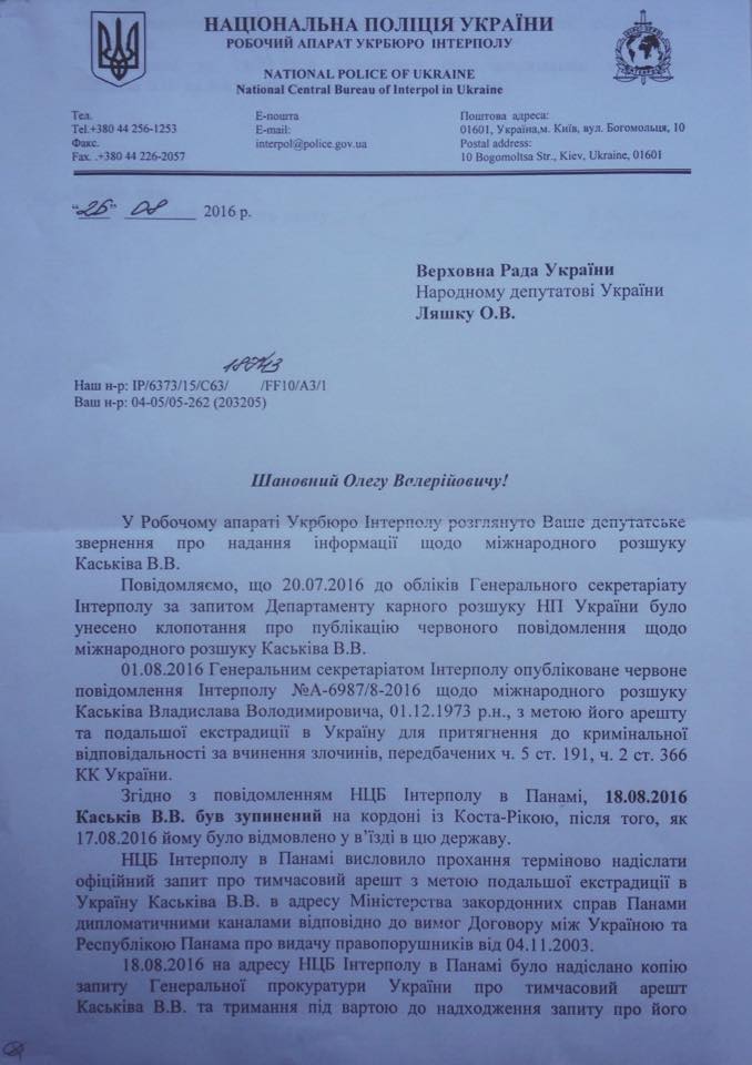 Лідер Радикальної партії Олег Ляшко отримав відповідь Нацбюро Інтерполу щодо ситуації із Каськівим. У документі, зокрема, йдеться про те, що до цього відомства «інформація про затримання Каськіва в Панамі не надходила». Про це політик написав на своїй сторінці у Facebook та виклав фото листа.