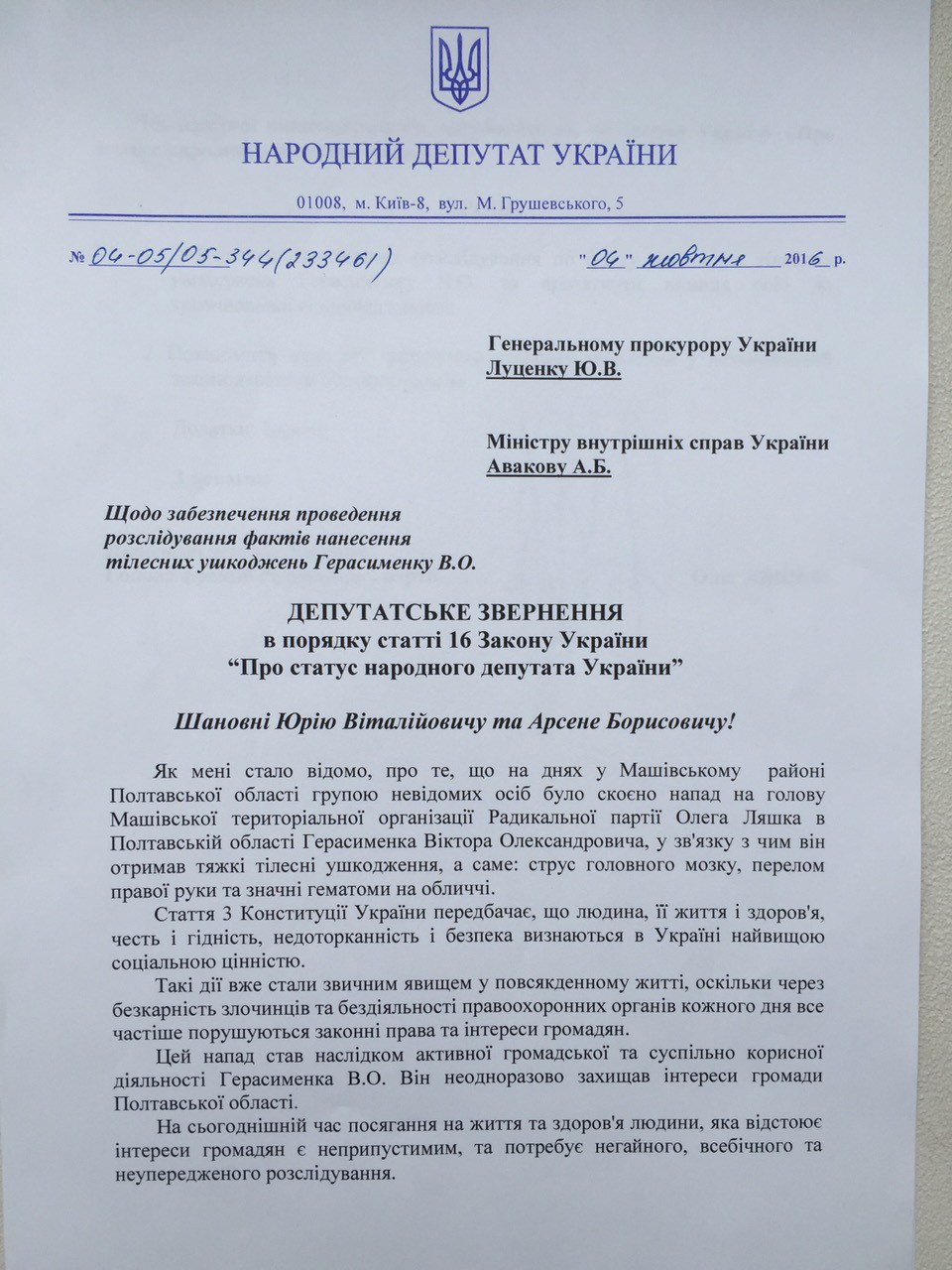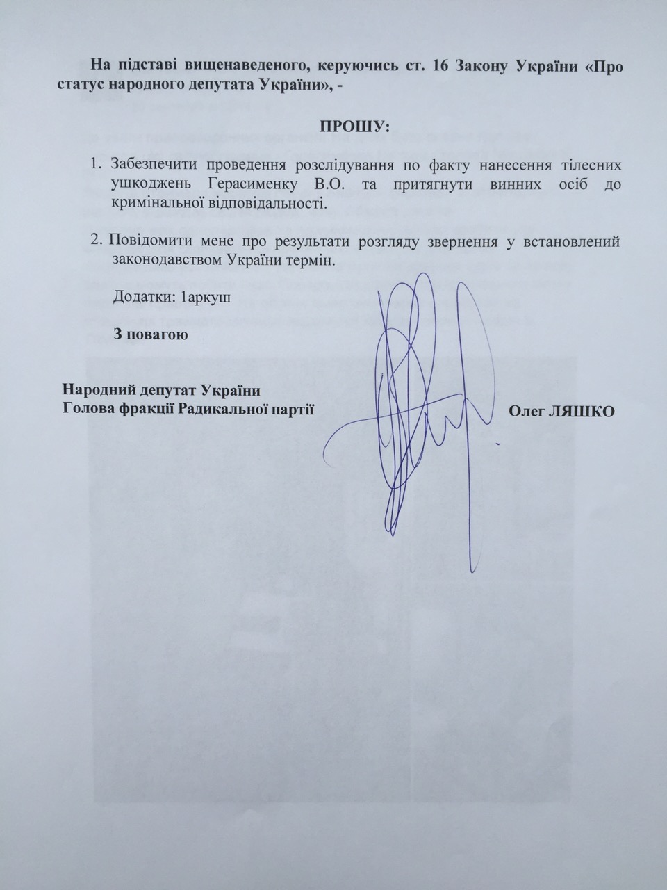Лідер Радикальної партії Олег Ляшко особисто висловив постраждалому слова підтримки і звернувся до Генерального прокурора і Міністра внутрішніх справ із вимогою розслідувати кричущий випадок.