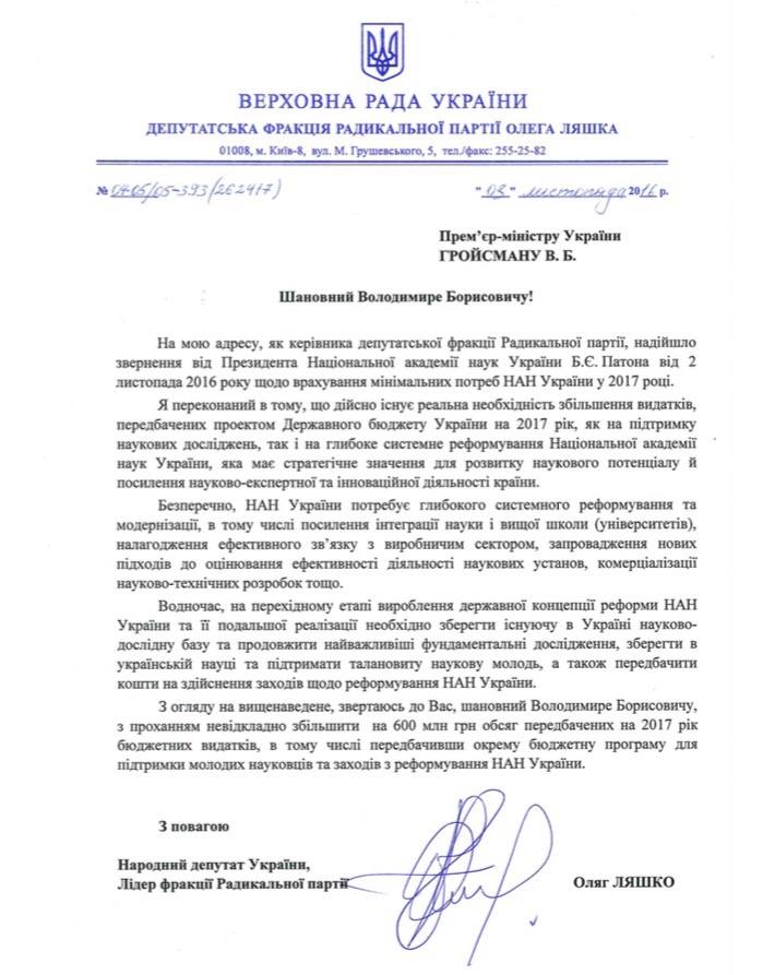 Лідер Радикальної партії направив звернення до Прем’єр-міністра України з проханням збільшити на 600 млн гривень обсяг передбачених на 2017 рік бюджетних видатків на Національну академію наук. Про це він написав на своїй сторінці у Facebook.