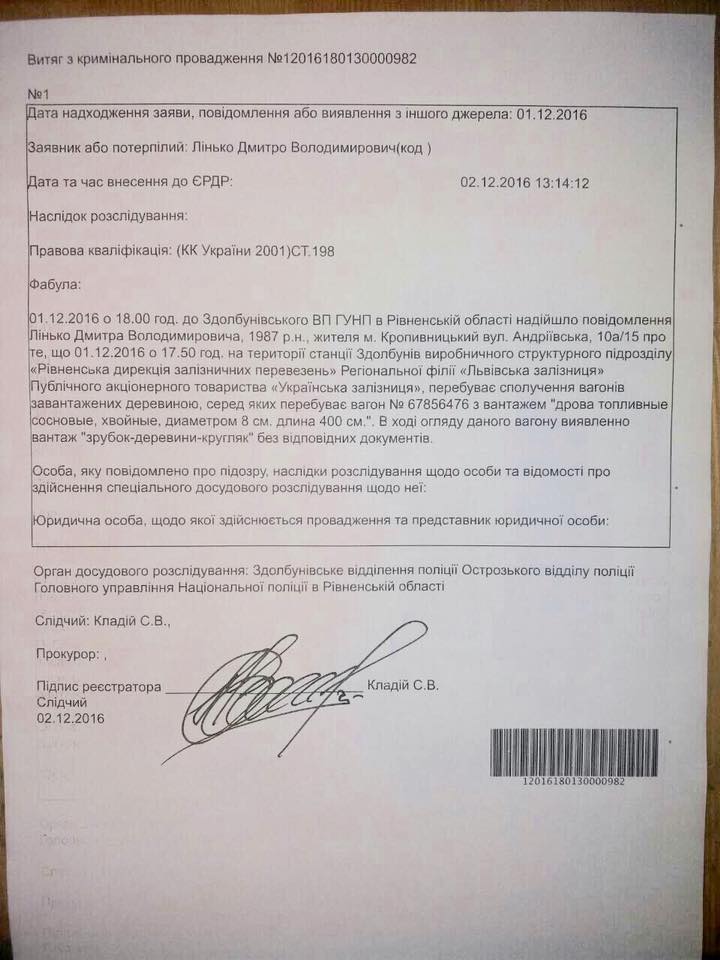 «Кримінальне провадження щодо незаконного вивозу лісу-кругляка, яке ми вчора зафіксували з Дмитро Лінько та Ігор Мосійчук на станції "Здолбунів" на Рівненщині.