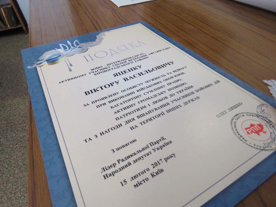 У День вшанування воїнів-інтернаціоналістів Народний депутат України від Радикальної партії Дмитро Лінько привітав ветеранів війни в Афганістані, які проживають у Кропивницькому, та вручив їм подяки від лідера РПЛ Олега Ляшка.
