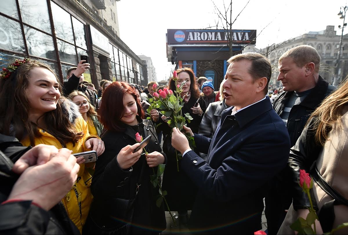 Святковий флешмоб продовжився на головній вулиці країни. На Хрещатику довкола лідера радикалів також зібрався натовп жінок, які хотіли особисто почути привітання від Олега Ляшка та зробити з ним селфі.