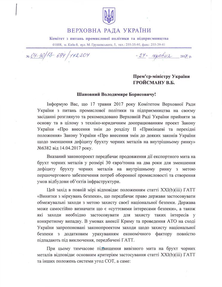 Як зазначається у зверненні депутата, норми законопроекту №6382 в повній мірі відповідають положенням статті XXI(b)(iii) ГАТТ «Винятки з міркувань безпеки», що передбачає право держави застосовувати обмежувальні заходи з метою захисту своєї національної безпеки. Держава може самостійно визначати, що є «суттєвими інтересами безпеки», а також які заходи необхідно застосовувати для захисту таких інтересів у конкретному випадку. В умовах анексії Криму та проведення АТО на Сході України запропоновані законопроектом заходи щодо захисту національної безпеки з додатковим урахуванням економічного фактору повністю підпадають під виключення, передбачені ГАТТ. При цьому тимчасове підвищення вивізного мита на брухт чорних металів відповідає основним критеріям застосування статті XXI(b)(iii) ГАТТ та інших положень системи угод СОТ.
