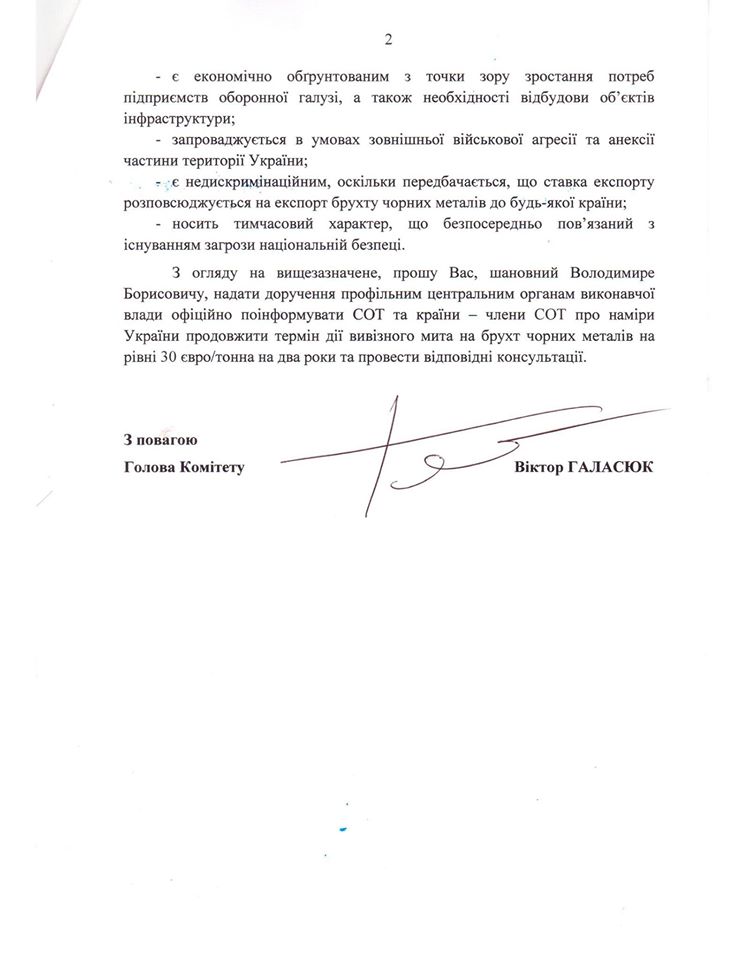 Україна має офіційно поінформувати СОТ та країни - члени COT про наміри продовжити термін дії вивізного мита на брухт чорних металів на рівні 30 євро/т на 2 роки та провести відповідні консультації. Із пропозицією дати відповідне доручення профільним міністерствам до Прем’єр-міністра звернувся заступник Лідера РПЛ з економічної політики, голова парламентського Комітету з питань промислової політики та підприємництва Віктор Галасюк