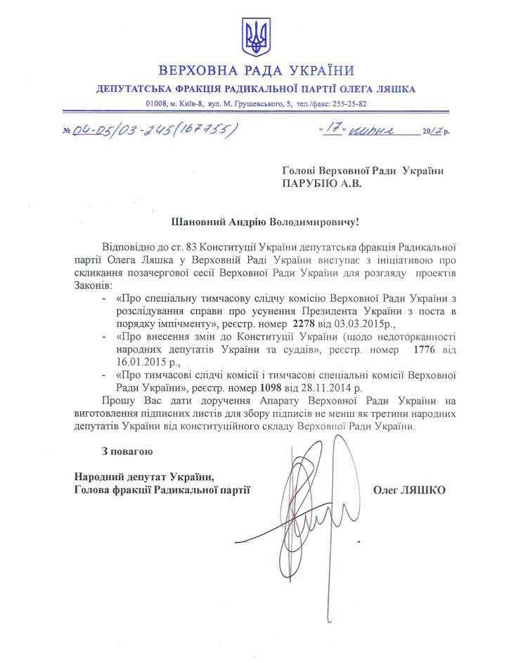Фракція Радикальної партії ініціює позачергове засідання сесії Верховної Ради для розгляду законопроектів про скасування депутатської недоторканості, про процедуру імпічменту Президента України та про Тимчасові слідчі комісії парламенту. Про це написав лідер РПЛ Олег Ляшко на своїй сторінці у Facebook.