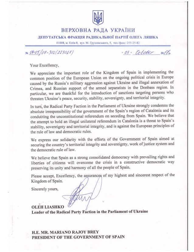 Лідер Радикальної партії Олег Ляшко написав лист прем’єр-міністру Іспанії Маріано Рахой, в якому засуджує дії уряду іспанського регіону Каталонія, та висловив підтримку уряду Іспанії у боротьбі із сепаратизмом. Політик пов’язує кризу в Європі із російською агресією в Україні.