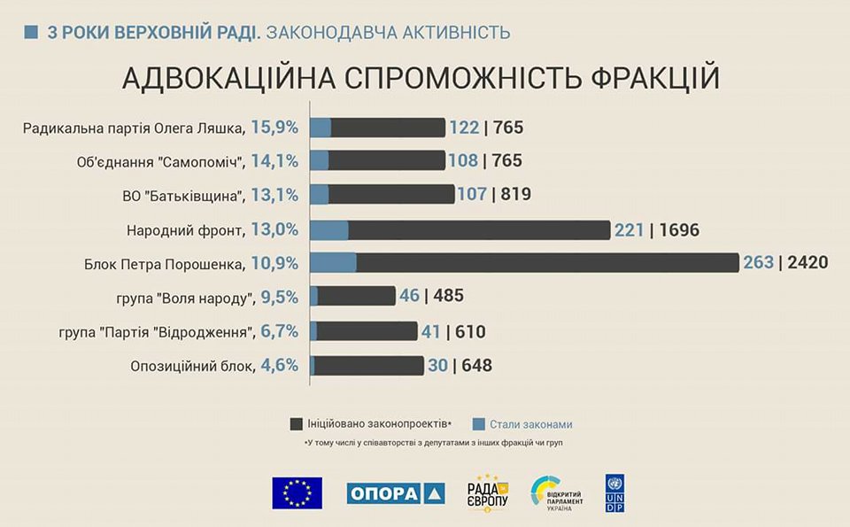 Коефіцієнт співвідношення між ухваленими та ініційованими Радикальною партією законопроектами виявився найвищим серед усіх парламентських фракцій. За три роки роботи у Раді депутати від фракції РПЛ зареєстрували 765 законопроектів, з них 122 або 15,9% після голосування стали законами. Це найкращий показник результативності серед усіх фракцій.