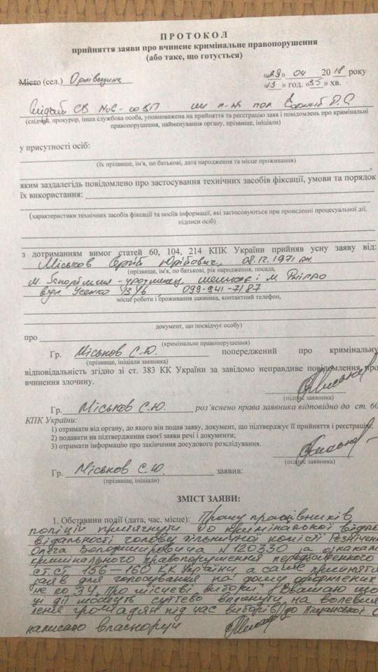В селі Орлівщина Новомосковськго району поліцією складено протокол про грубі порушення, виявлені на дільниці № 120 330. Кандидат в депутати від РПЛ Сергій Миськовий зафіксував порушення. Він разом з спостерігачами переглянув бланки заяв голосування на дому, виявив, що 59 заяв були надруковані на комп'ютері. Вісім - одним почерком. Всього в селі на дому голосували 68 осіб.