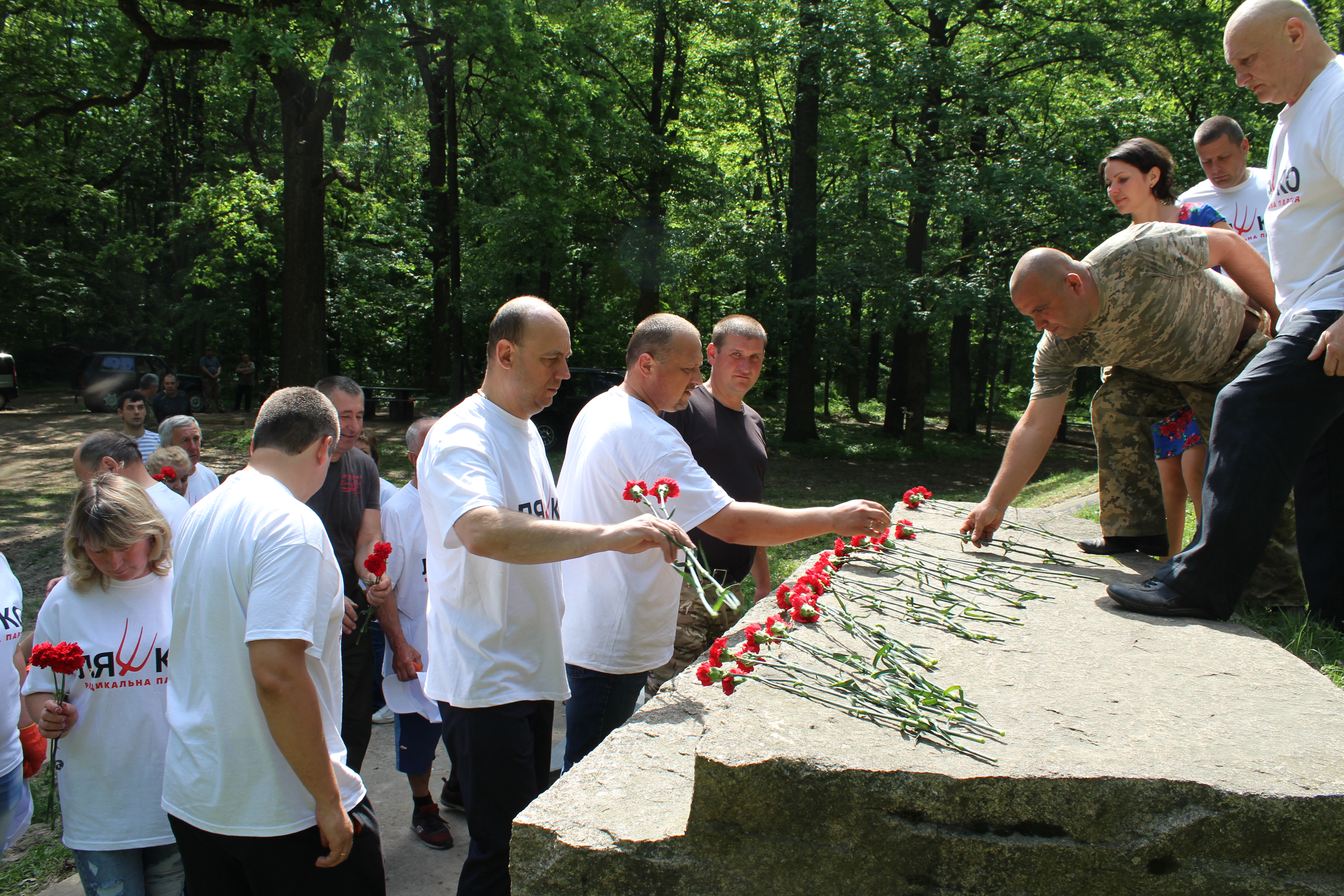 Вирішили упорядкувати це місце. Партійці та учасники нинішніх бойових дій на Сході України дружно косили траву, прибирали сміття, фарбували. Насамкінець установили дві лавочки обабіч братської могили партизанів, а по закінченню суботника вшанували полеглих квітами.