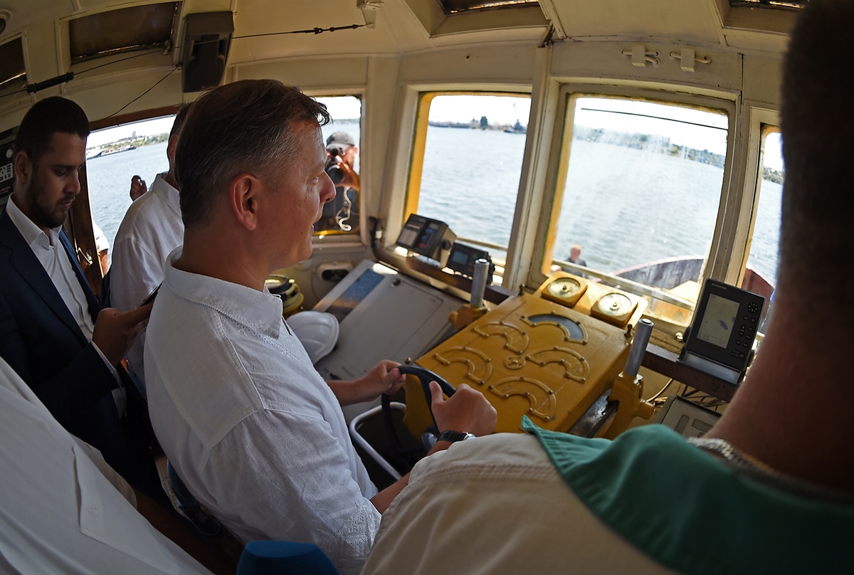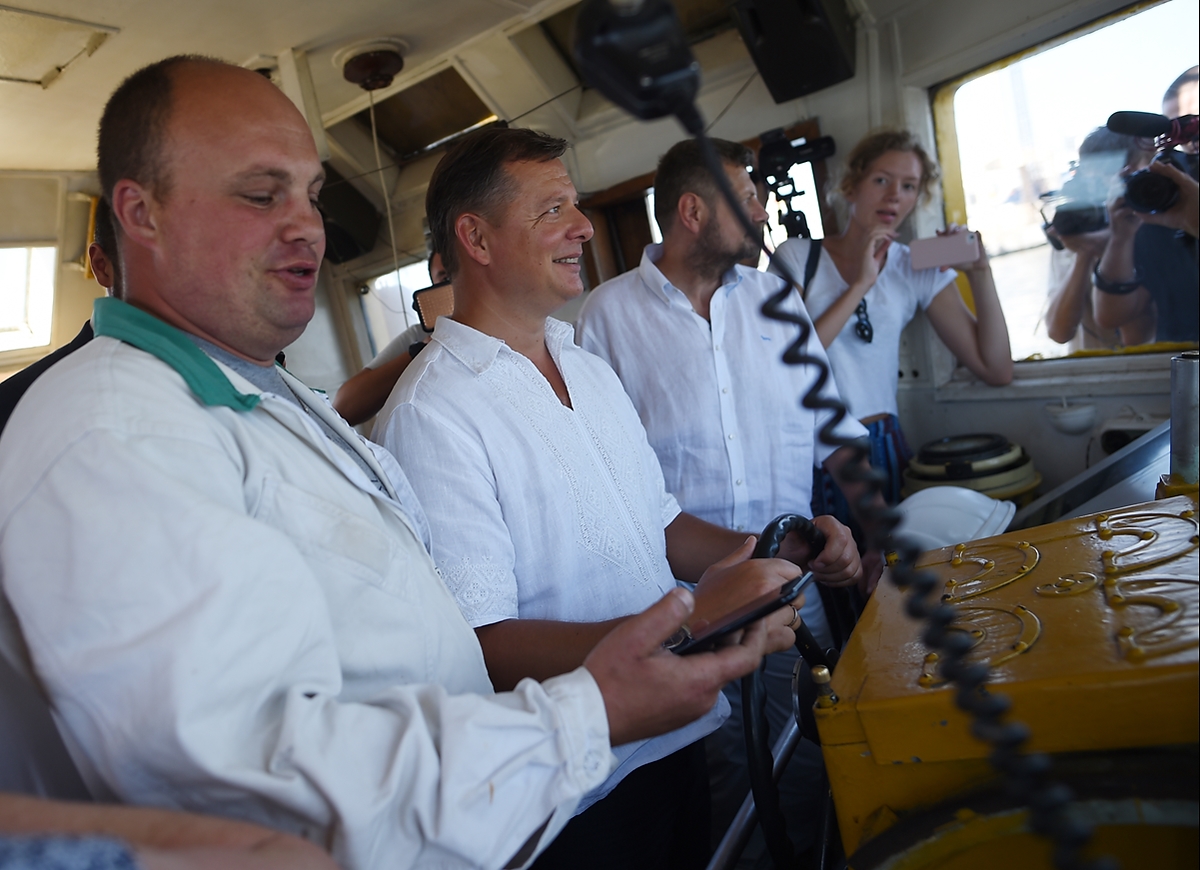 За штурвалом судна «Лиман» Іллічівського суднобудівельного заводу Олег Ляшко розповів, як відбудувати економіку країни. Політик вправно керував потужним кораблем, отримавши тільки кілька порад від досвідчених мореплавців.