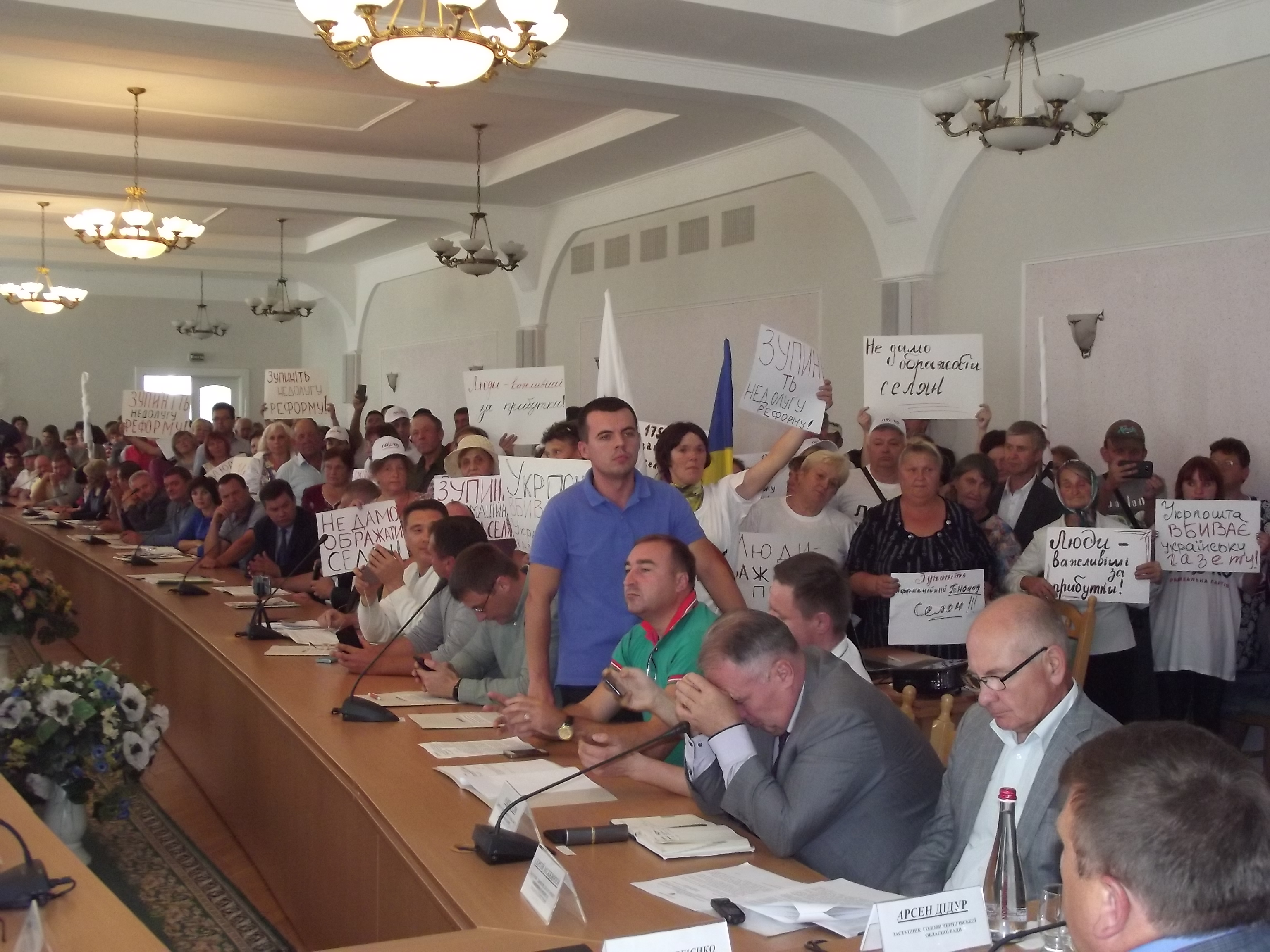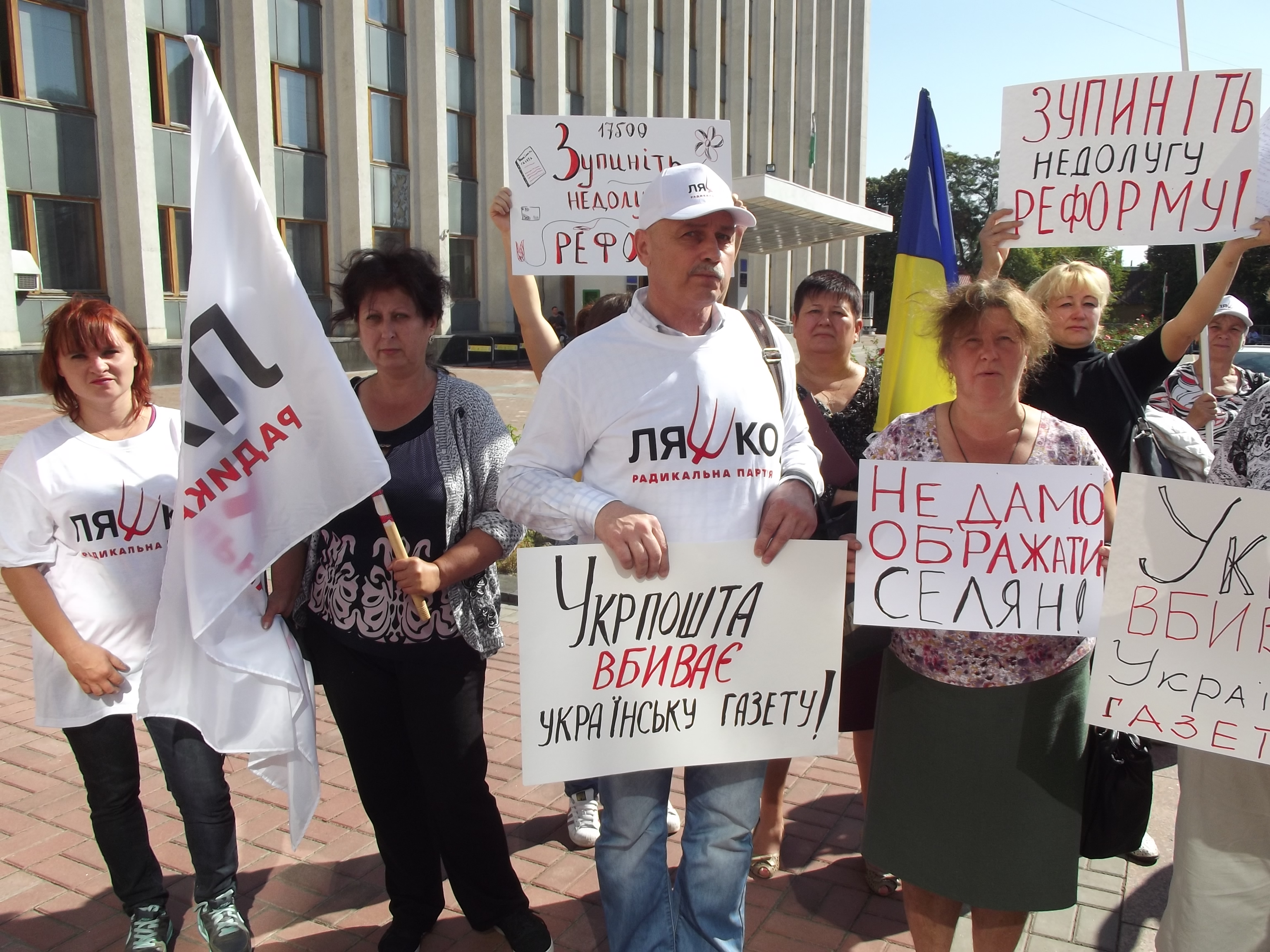 Пікетувальники зайшли в залу засідань і вимагали припинити «ганебну» реформу Укрпошти, спрямовану на закриття поштових відділень по селах а також звільнити директора обласної філії Олену Дорошенко, яка не йде на діалог з людьми і, незважаючи на значний спротив сільського населення пілотному проекту «Сільське відділення», продовжує закривати стаціонарні відділення по селах і звільняти листонош.