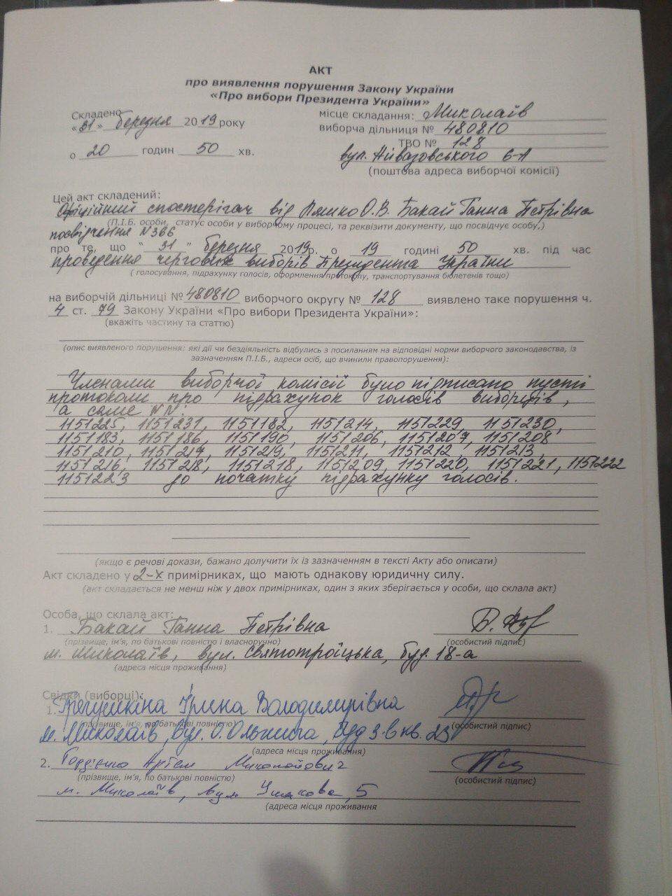 У Миколаєві, виборча дільниця №480810, ТВО №128, членами виборчої комісії були підписані пусті протоколи про підрахунок голосів виборців до початку самої процедури підрахунку. Акт склала спостерігач від кандидата в Президенти України Ляшка О.В. Бакай Ганна Петрівна.
