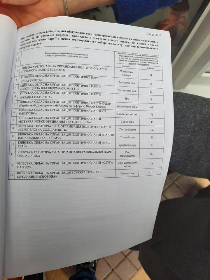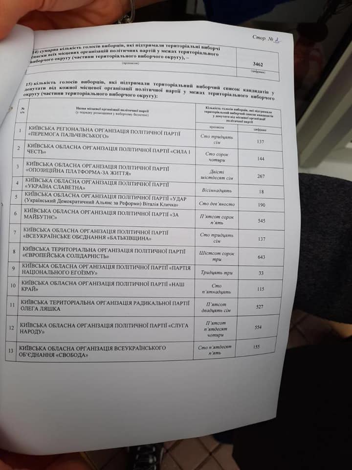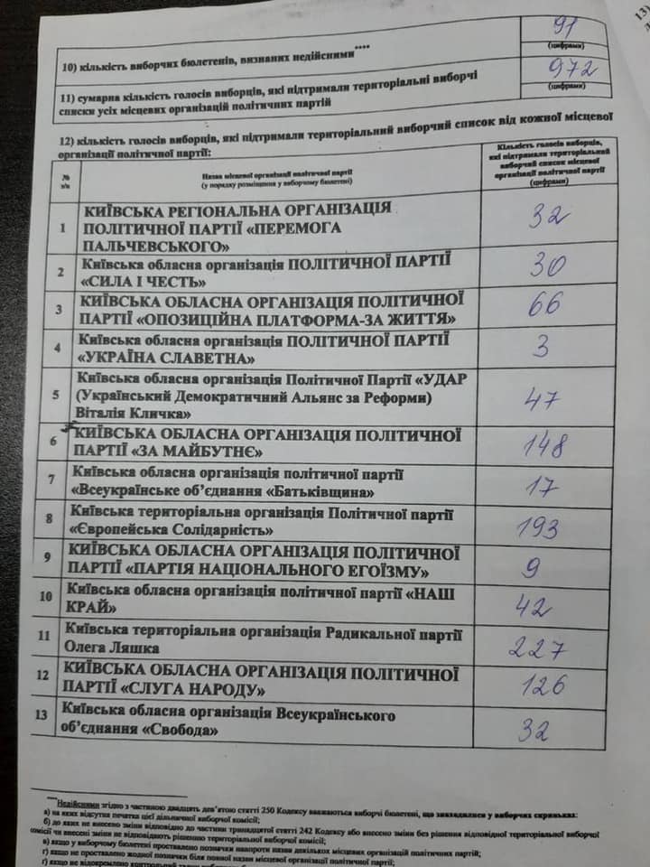 «У РПЛ, зокрема, на Київщині вкрали сотні голосів після так званого уточнення протоколів. Подивіться на ці первинні протоколи з Фастівського району! Сотні людей голосували за РПЛ, але в «уточнених» в ТВК протоколах за нашу партію - одні нулі. Такі нечесні вибори в Україні востаннє були за Януковича», - написав Ляшко.