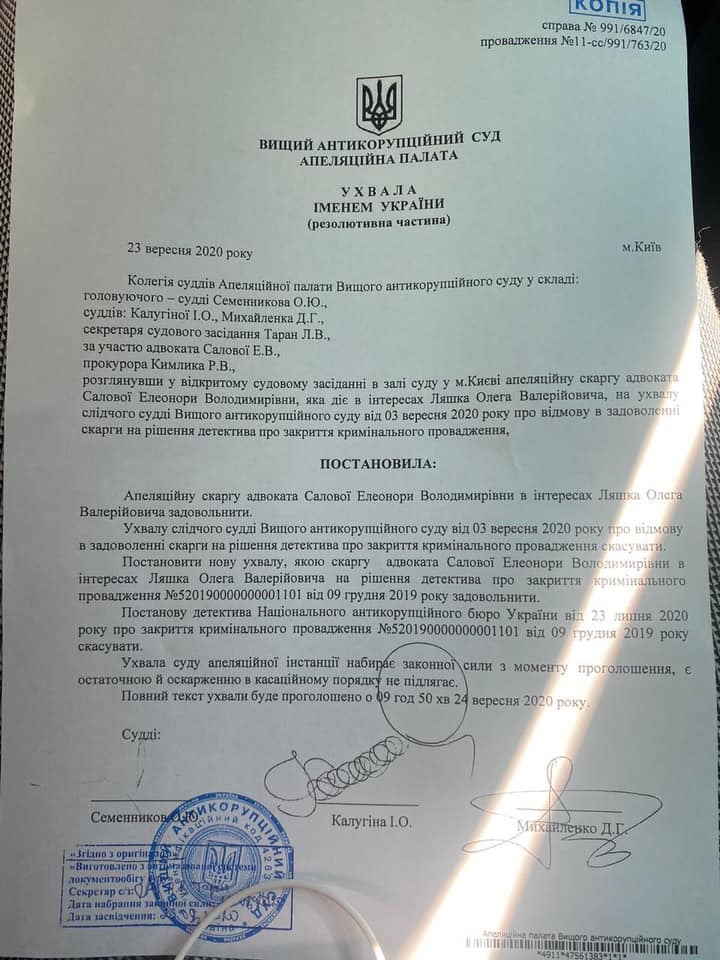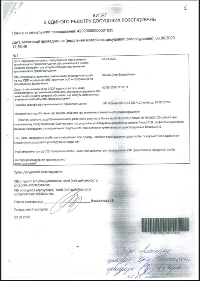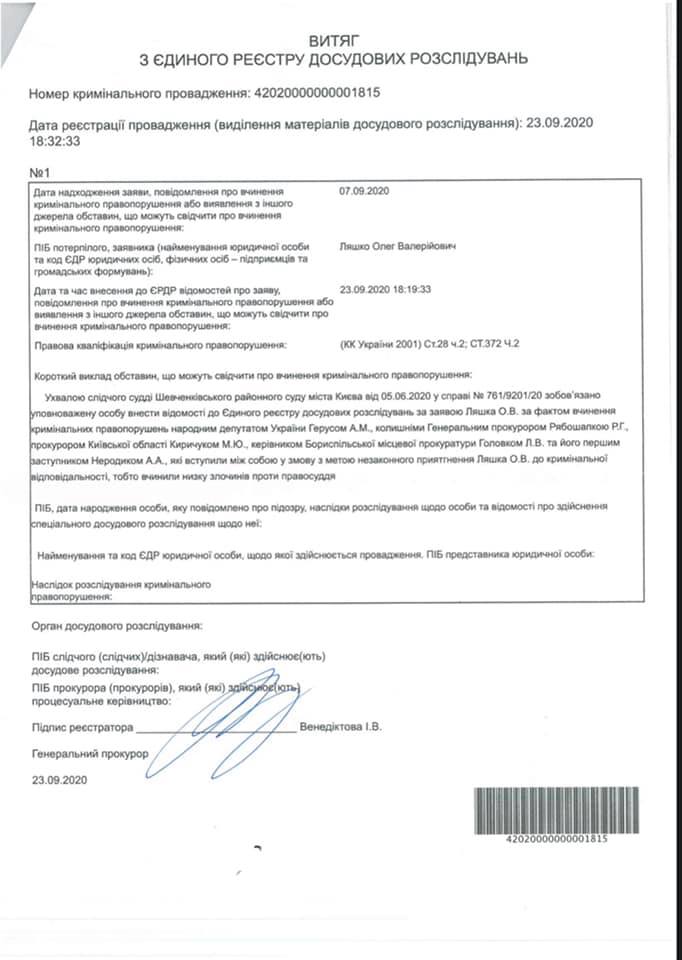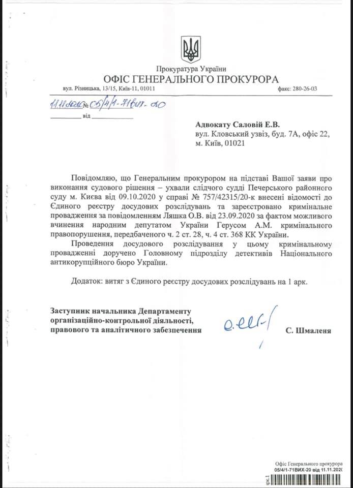 «Генпрокуратура за рішеннями судів, куди звернулися мої адвокати, зареєструвала два нові кримінальні провадження справи проти слуги Росії Геруса. Одне - про його змову з бориспільськими прокурорами і колишнім генпрокурором Рябошапкою, щоб незаконно кинути мене за грати. Друге - за фактом отримання Герусом хабаря», - написав Ляшко і додав відповідні документи.